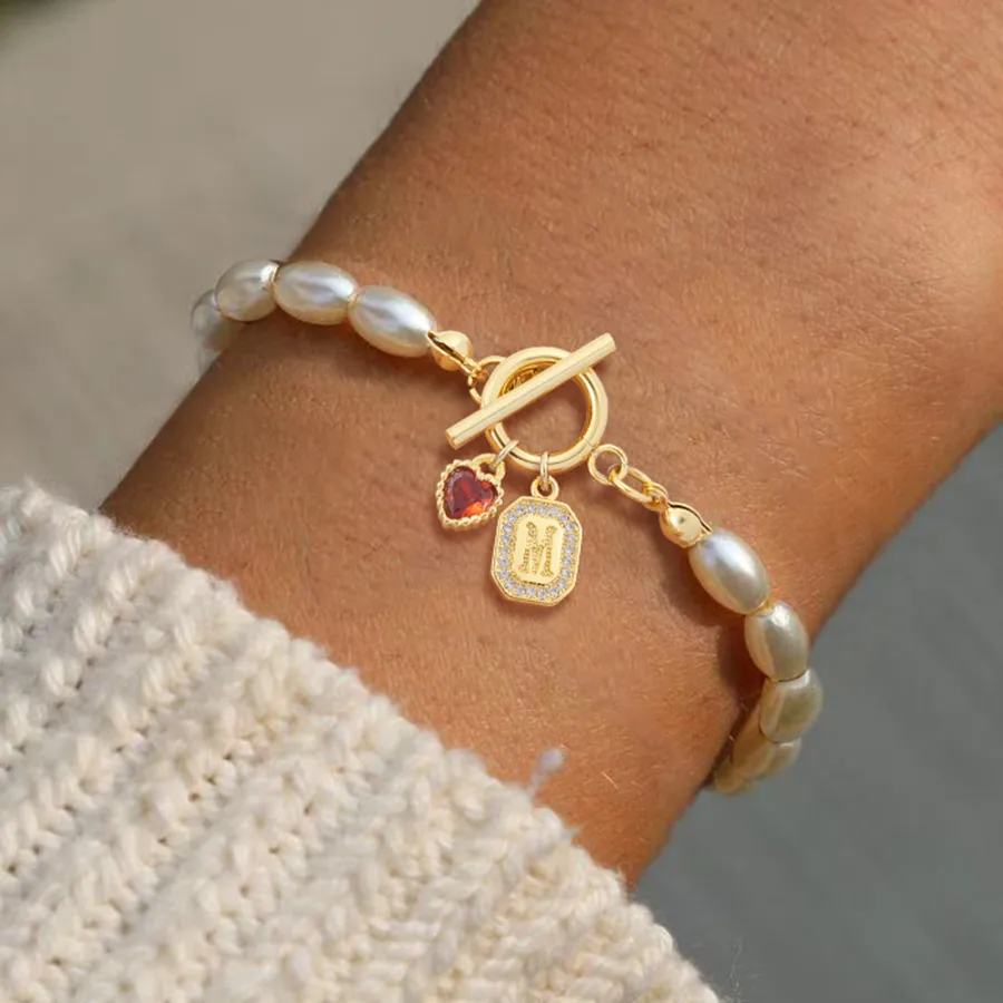 Pulsera de perlas para mujer con colgante inicial y corazón en circonia microengastada — estilo clásico vintage con cierre de palanca